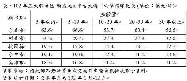 根據102年內政部實價揭露資訊,有巢氏房屋分析全台五大都會區的住宅大樓,以5年以內到30年以上屋齡為範圍,發現台北市、新北市10~20年屋齡的中古屋每坪均價分別為53.7萬及27.9萬,是雙北市均價最低的屋齡帶。